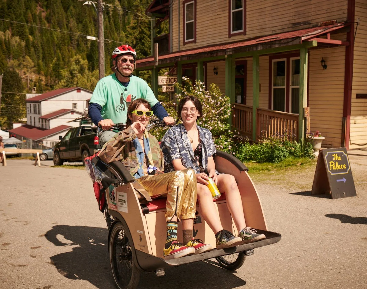 This photo shows two people riding in a pedal bike carrier, being powered by man who is wearing a green bike helmet. There are two hotels in the background on the streets of Ymir